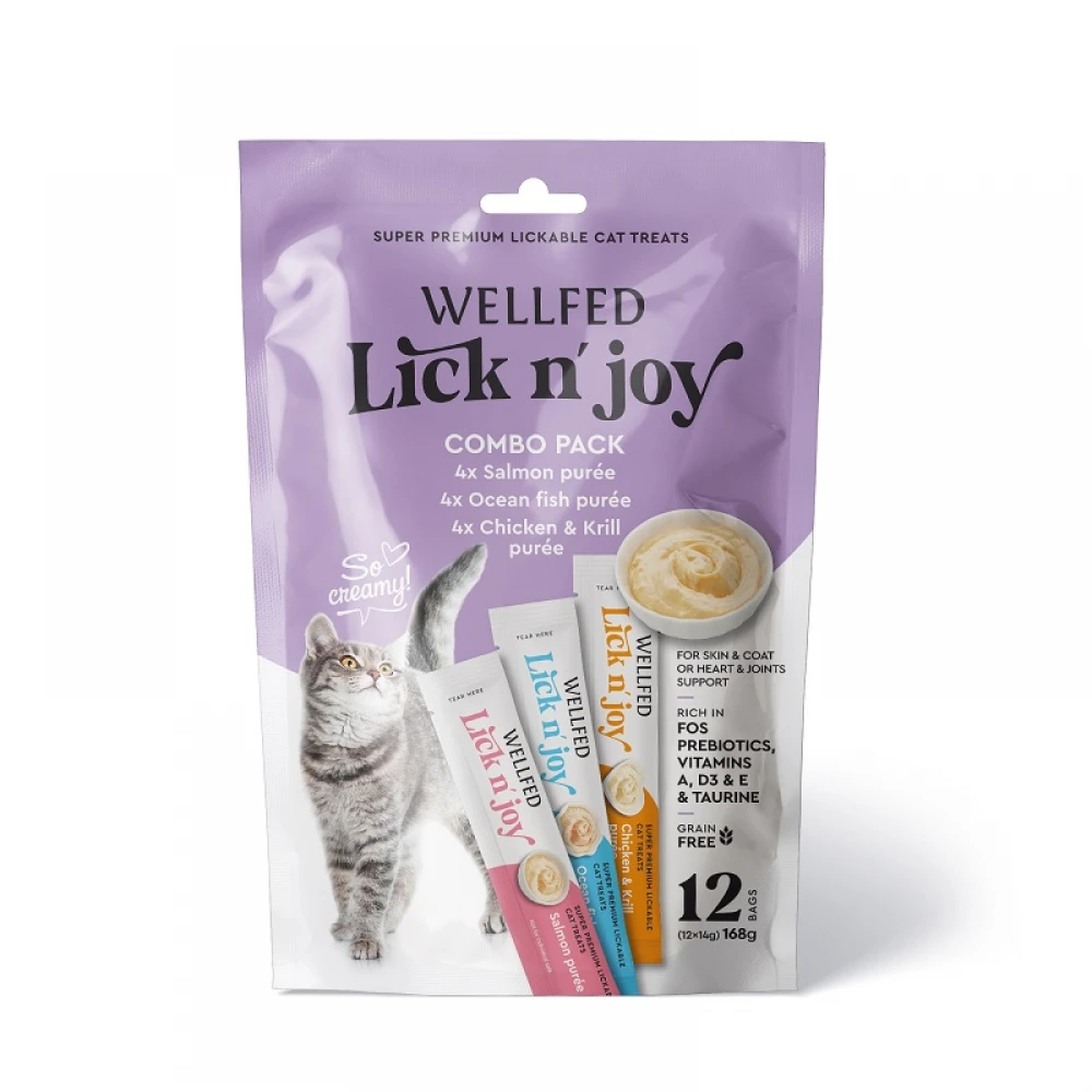 ΛΙΧΟΥΔΙΑ ΓΑΤΑΣ WELLFED LICK N’ JOY COMBO PACK SALMON-FISH-CHICKEN PUREE (12x14g) 168g